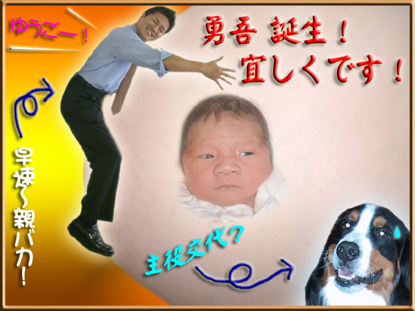 ■予定日から、ほぼ10日遅れの午前4時、家内が陣痛を訴え私を起こした。普段、寝ると根性のある私も~この時ばかりは飛び起きた。急いで車で病院まで運び、運び、運び・・・やることが無いので会社に出た。お昼を過ぎた頃~先生から連絡が入り、また病院へ。そこで見た光景は~明け方、送り届けた時の様子とは、まるで違っていた。ドアを開けた途端、家内が断末魔のような悲鳴を上げ、激痛にのたうち回っていたのである。今まで見た事の無いその光景に~正直、ビビった。話には聞いていたものの~【想像】が【現実】となって【経験】する~何とも言えない【緊張】である。「そのとき男は、なぁ~んも役に立たないからねぇ~!」そんな【声】が、頭をよぎる。<正に、その通りだ!>「せいぜい背中をさすってやるぐらいだよ!」<よし!さすろう!>私は「ひーひーふー!」と声を上げ、一生懸命~背中をさすった。その時、痛みで喋る事もままならない家内が一言。「は、や、す、ぎ」・・・情けないモンである。暫くすると先生が「では、分娩室へ参りましょう!」と。「ご主人も立ち会われますか?」「え~え~え~・・・待ちます。」私は廊下の長椅子で待つ事にした。が!~ここでも【声】が!「育てていく上で~立ち会った方がいいよ!」「女性の領域だからヤメた方がいいぜ!」「立ち会うにせよ~前からは見ない方がいいよ!」etc・・・幾つもの【声】が交錯し、小一時間が経った。悩みに悩んだ挙句~<よし!立ち会おう!>と決め、立ち上がったその瞬間!分娩室から「オンギャー!」と・・・。取り出されたばかりの勇吾は正に赤ちゃん~全身を血液に染められた・・・正に【赤ちゃん】であった。<あれ?俺みたい?>と思いつつ、近づくにつれ~涙で見えなくなった。全身が言い表せない【感動】で震えた。【グラチャン】の時とは比べモノにならない程である。当たり前である。そして同時に【感謝】した。家内に・・・全ての事に・・・。そして、<見せてあげたかった>という思いも・・・。