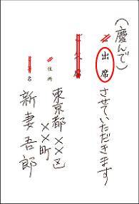 ■期日に遅れても、謝り、出す。そんなことがないように、案内書が届いたら、即、出す。礼儀をわきまえている人、必ず一番初めに返事をくれる人・・・皆さんのお付き合いする方々の中でも、決まっていませんか?その人は本当に【気がきく人】なのです。したがって私は、気の知れた仲間には「おめでとう!慶んで【出席】するに決まってんじゃねぇ~かっ!!」と即出しするようにしています。また、【欠席】の際には、【出席】のときと同様、【ご欠席】の【ご】を【//(斜め二斜線)】で消し、【欠席】に丸。そして下には「(欠席)させていただきます。」と・・・更に、「やむを得ず欠席するのが残念」といった調子のコメントや、行けないことへの理由を添えると、その人は礼儀作法を心得ている方です。そして、出席なら欠席を、欠席なら出席を、一目で見て分かるように【縦二本線】で消しておくのが、作法です。また【ご住所】の【ご】も【//(斜め二斜線)】で消し、住所を。そして意外に多いのが、最後の【ご芳名】です。【ご】を消される方はいらっしゃるのですが、【芳】を消し忘れる方が意外に多いのです。【芳】は【ご】と同様、【敬称】ですので、消すのが常識です。勿論、宛先の面も【宛】や【行】などを【//(斜め二斜線)】で消し、【様】と書くのが常識、【当たり前のこと】です。 |