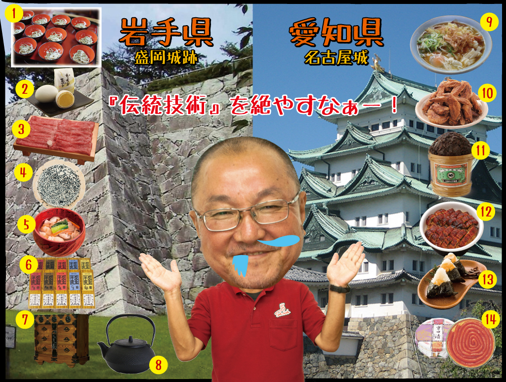 ■①わんこそば。御椀にいれた一口大のそばを、食べるごとに給仕が御椀にそばを入れてくれる。御椀をお客さんの前に重ねるパフォーマンスがある。御椀にふたができないとどんどんそばを入れられて終わらない。盛岡が有名ですが起源は花巻と聞いたような気がします。■②かもめの玉子。白餡の入った玉子型菓子で小学校の臨海学校に行った時にお土産で買った記憶がある。三陸の郷土菓子。